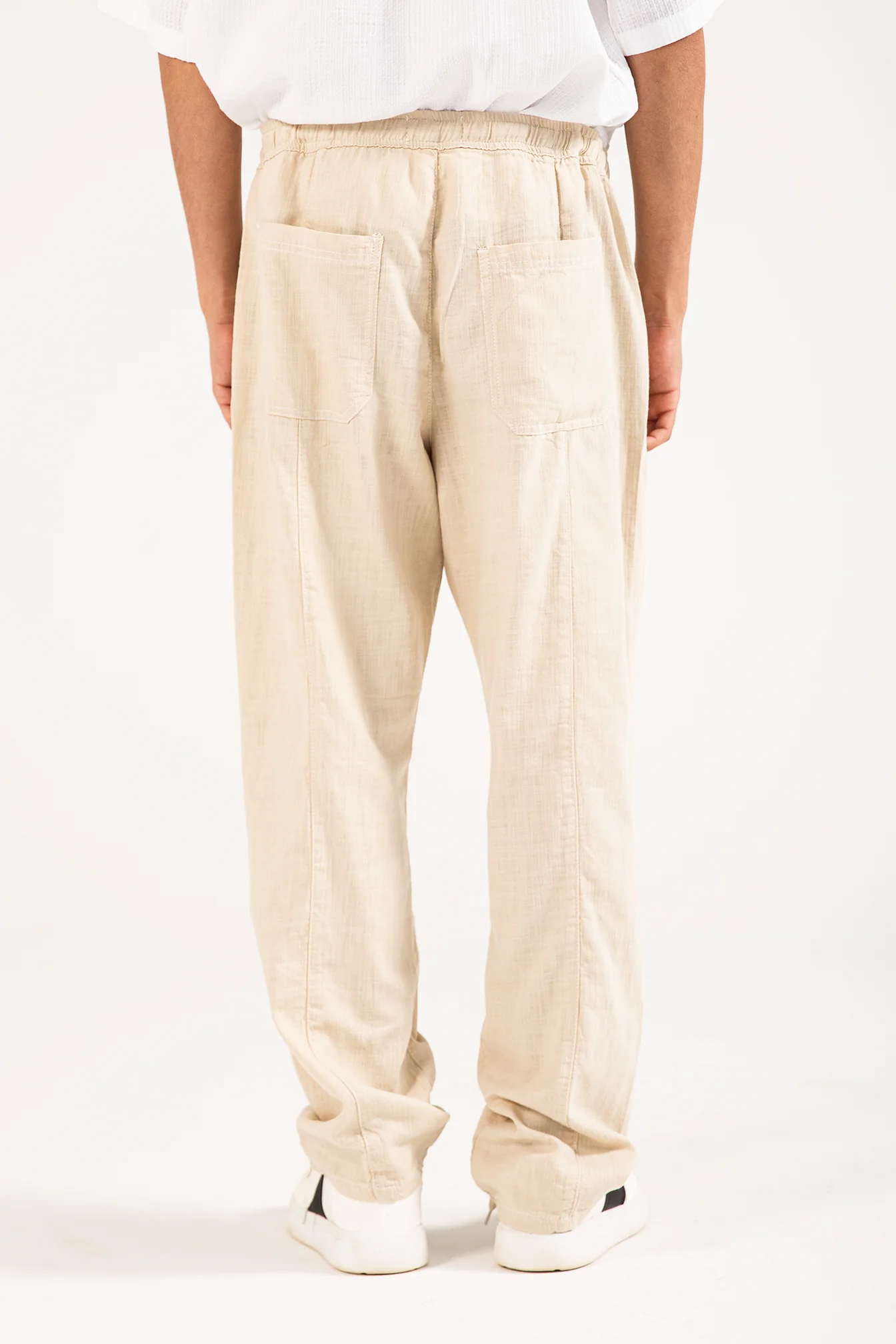 Straight fit beige cotton trousers with a textured finish, an elasticated drawstring waist, and two back pockets.